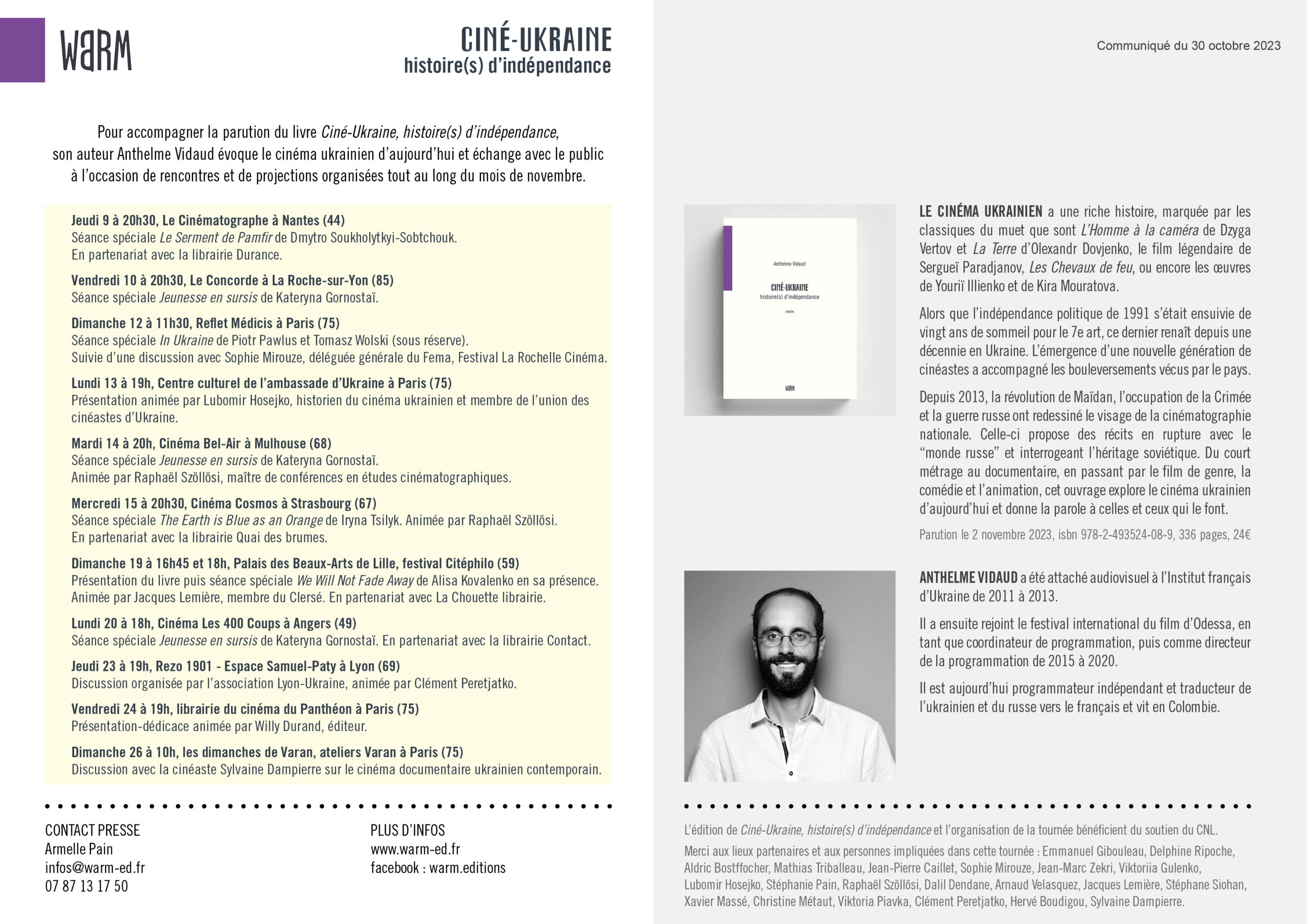 Tout au long du mois de novembre, Anthelme Vidaud sera en France pour accompagner la sortie du livre et parler du cinéma ukrainien d’aujourd’hui à l’occasion de rencontres et de projections (voir encadré plus bas et dans le communiqué ici).